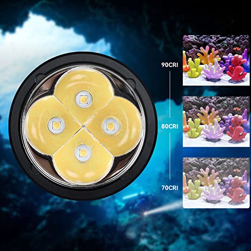 Torcia subacquea super luminosa - Dotata di 4 lampadine LED Samsung LH351D. Massima luminosità di uscita 5000 lumen. Fornisce una luce bianca neutra super luminosa, 5000K alta 90 CRI. Viene fornito con 2 batterie 5000mAh 26650, tempo di funzionamento massimo raggiunge 3.4hours su alto, 9 ore su medio e 28 ore su impostazione bassa.
