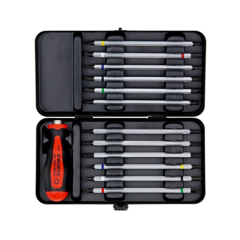 Assortimento acustico di trasmissione con manico variabile. 13-Part Description: Operazione con una sola mano Non modificare la lama necessaria per la modifica tra cacciavite e manico a T. Può essere utilizzato come normale cacciavite nella posizione diretta attraverso la posizione della maniglia regolabile. così come manico a T nella posizione di 90 °. Maniglia a 2 componenti • Per il funzionamento confortevole e senza affaticamento • Registrazione della lama: acciaio inossidabile ad alta resistenza con registrazione da 1/4 di registrazione 12 Locking di trasferimento di alta qualità • Selezionare la lama di abbinamento - Plug In The Handle - Pronto! • Con Würth Color Control System per assegnazione rapida • Registrazione 6-Kant 6.35 mm = 1/4 • Adatto anche come un po 'a lungo per il contenuto del cacciavite senza cordone: • Cacciavite con funzione T-Handle • 1 1 Blade PH 1 - Slot 4 mm;