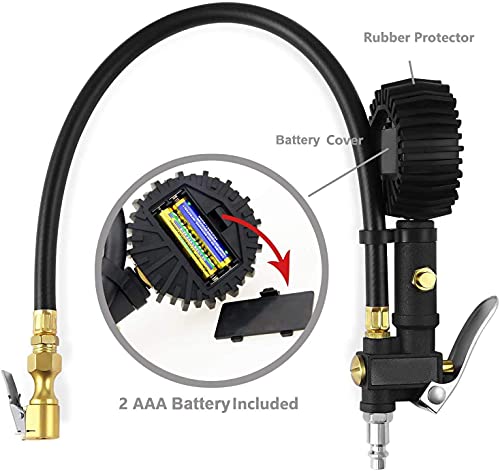 Struttura anti-perdite: il manometro è realizzato in metallo e un tubo in gomma, stente alle esplosioni, antistrappo e durevole. L'interfaccia per tubo flessibile e ugello in ottone di alta qualità da 36 cm può bloccare direttamente l'ugello, dire addio alla a e offrire un'eccellente tenuta per evitare perdite d'aria quando si rileva la pressione dei pneumatici e lo pneumatico (con nastro di guarnizione).