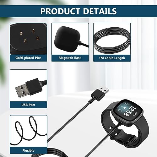 Xahpower Caricabatterie per Fitbit Versa 3, 2 Pezzi Cavo Caricatore USB Compatibile con Versa 3 / Versa 4 / Sense/Sense 2, 100CM Ricambio Cavo Magnetico di Ricarica Caricabatteria
