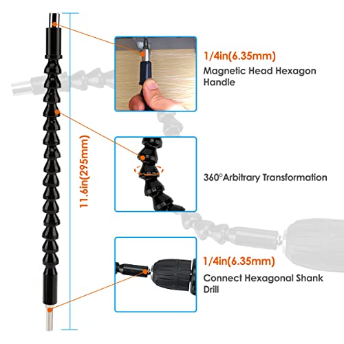 【Estensione della punta del trapano pieghevole】 La lunghezza di questo trapano flessibile è di 295 mm (11,6 pollici), l'impugnatura esagonale e la testa esagonale interna sono 6,35 mm (1/4 di pollice). La punta del trapano flessibile può essere ruotata e ruotata con molti angoli diversi. Utilizzato per il collegamento ai driver per dadi esagonali standard, seghe a tazza a impatto e punte a vanga.