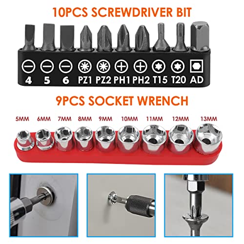 【Collocazione completa】 Il set di prolunghe per trapano include 2 prolunghe per punte da trapano pieghevoli, 3 pezzi di adattatore per presa universale da 1/4 "3/8" 1/2", 3 pezzi di 1/4" 3/8" ruotabile di 360 gradi 1 Set di chiavi a bussola girevoli da /2", 3 pezzi di prolunga per cacciavite magnetico, 1 prolunga ad angolo retto 105°, 1 chiave a bussola, 10 punte per cacciavite, 9 chiavi a bussola (5-13 mm), abbastanza per soddisfare le vostre esigenze lavorative quotidiane e di sostituzione.