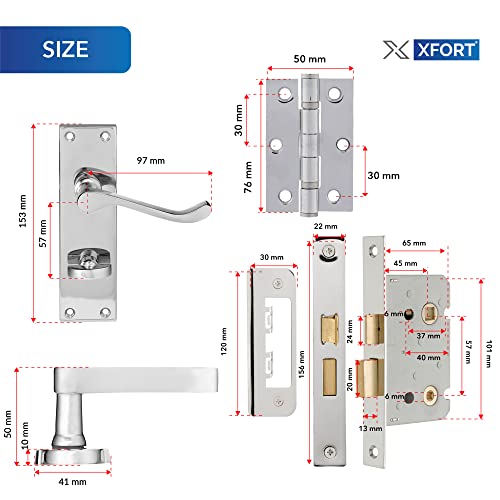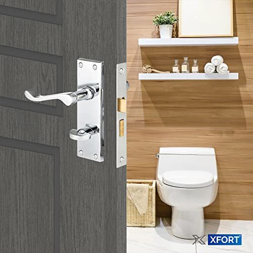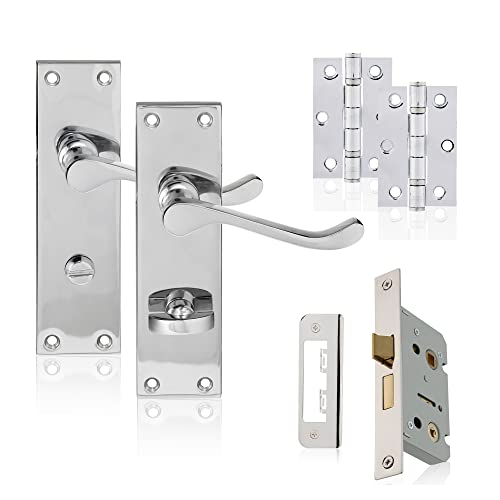 XFORT Chrome Elegance Range,Set completo di maniglie da bagno in stile vittoriano cromato lucido, con serratura da bagno da 65 mm e cerniere con cuscinetto a sfera da 75 mm, per porte interne in legno