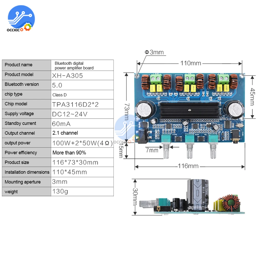 XH-A305 Bluetooth 5.0 Stereo Digital Power Amplifier Board Module TPA3116D2 50Wx2+100W 2.1 Channel Audio Bass Subwoofer AUX AMP