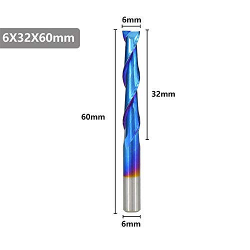Xianglaa-Router Bit, Flat End Mill 6mm Shank Nano Blue Coated 2 Flute Spiral Fresatura Cutter Cutter Router di carburo Bit CNC End Frecing Bit, Alta qualità (Cutting Edge Length: 6x32x60)