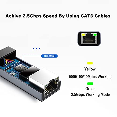 【Adattatore LAN Ethernet ad alta velocità 2.5G】 Chipset Realtek integrato: RTL8156B, 2,5 volte più veloce di 1Gbps Gigabit Ethernet e retrocompatibile con 10/100/1000Mbps. Supporta il rilevamento e la correzione automatica dei crossover del doppino intrecciato, il trading automatico del tasso, la connessione di rete stabile