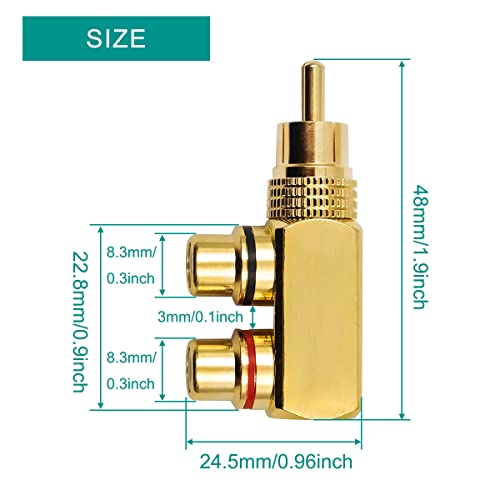Xiatiaosann Adattatore Splitter RCA, RCA Maschio a 2 RCA Femmina Y Splitter per Cavo Audio Stereo Phono, 2 Pezzi Connettore ad Angolo Retto 90 Gradi per Altoparlante Amplificatore DVD