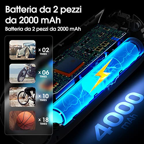 【Pompa d'aria multifunzionale con batteria al litio da 2000 mAh con funzione torcia】: questo compressore d'aria è ideale per gonfiare facilmente pneumatici di auto e moto, palloni e molti altri oggetti. Dotato di una potente batteria al litio ricaricabile da 2000 mAh. I LED COB luminosi ti consentono di trovare tutte le valvole anche al buio.