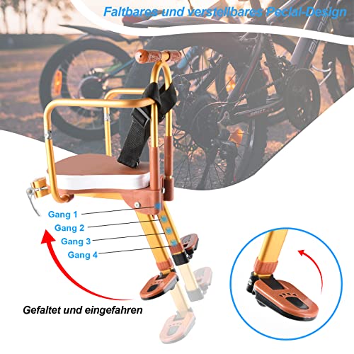 [Design pieghevole unico] Recinzione del seggiolino per bicicletta per bambini, le maniglie e i pedali utilizzano un design pieghevole unico che può essere aperto o piegato in un secondo. Dopo che il sedile è piegato, può essere trasportato in una custodia. I pedali possono essere regolati in quattro livelli per soddisfare le esigenze del tuo bambino.