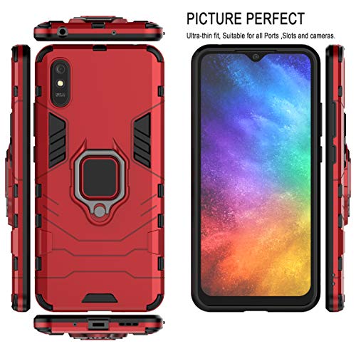 XIFAN Custodia per Xiaomi Redmi 9A, Nuovo [Robusto] Tattico Anello Metallico Cavalletto [Funziona con Il Supporto Magnetico per Auto] Cover Paraurti, Rosso + 2 Pack Pellicola Protettiva