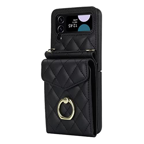 XIMAND Custodia portafoglio per Samsung Galaxy Z Flip 4 con anello e tracolla regolabile, stile elegante e multifunzionale a fisarmonica con 4 scomparti per carte di credito(Nero)