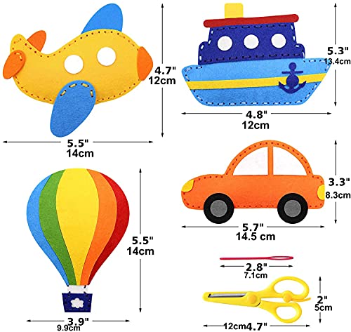 [Kit cucito per bambini] Il kit da cucito per mezzi di trasporto fornisce ai principianti e ai tuoi bambini tutto ciò di cui hanno bisogno per cucire i giocattoli. Il pacchetto include 12 modalità di trasporto (barche, barche a vela, auto, treni, aerei, elicotteri, scuolabus, auto della polizia, autobus)., ambulanze, autopompe e mongolfiere) aghi da cucito 6 x 7 cm, 1 x cotone, 1 x forbici di sicurezza per bambini, 7 x filo da cucito colorato, 1 x sacchetto di cotone