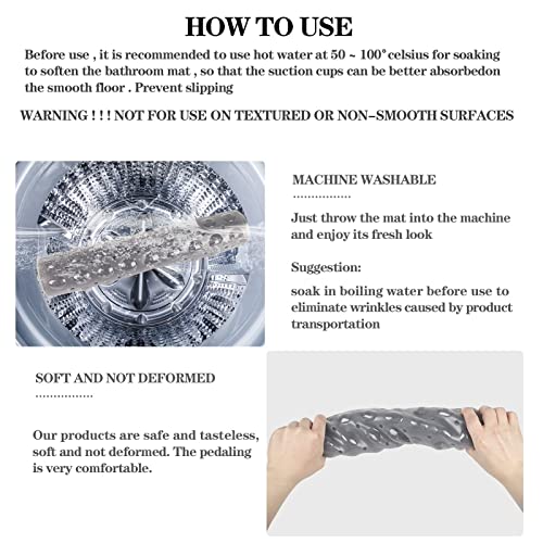 Suggerimento: fissare le ventose prima dell'uso dei tappetini da bagno antiscivolo per la vasca da bagno interna. Non utilizzare tappetino antiscivolo da bagno su superfici ruvide o non lisce. Non saltare sui tappetini da bagno.