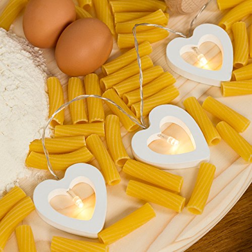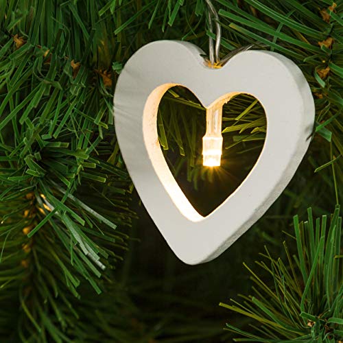 XMASKING Catena a Batteria 1,35 m, 10 Cuori in Legno Bianco Ø 55 mm, LED Bianco Caldo, Luce Fissa e Flashing, luci per Albero di Natale, Decorazione Natalizia