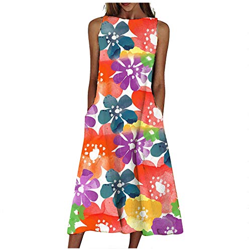 Xmiral Abito da Donna Abito Lungo Senza Maniche con Tasche Larghe e Maniche Lunghe Abito retrò con Stampa O-Collo (S,5arancia)