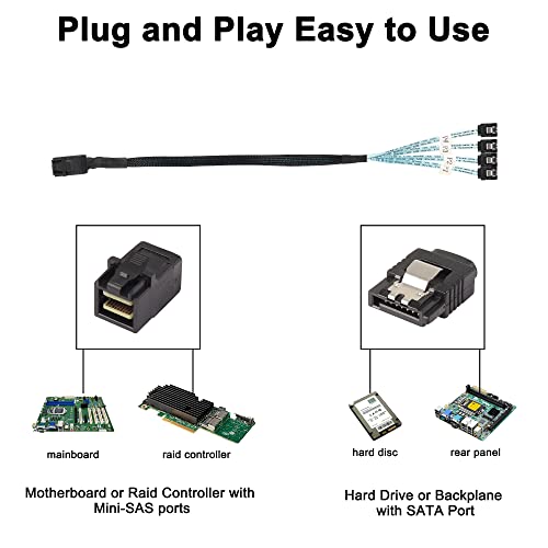 Questo set include Mini SAS hd a SATA cavo 1.6FT / 0.5M (1xPCS). Assicurarsi che Mini SAS (SFF-8643) sia presente sulla scheda madre o sul controller RAID. Quando lo si utilizza, non collegare il connettore Mini SAS hd SFF-8643 al backplane, altrimenti il cavo da SFF-8643 a sata non funzionerà con loro