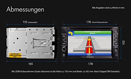 XOMAX XM-2DTSBN6214 Autoradio con navigatore GPS + Funzione vivavoce Bluetooth + Display touch screen da 6,2" / 16 cm con risoluzione HD, 800 x 480 pixel, formato 16:9 + Lettore CD / DVD + Porta USB (fino a 128 GB!) + Slot per schede micro SD (fino a 64 GB!) + Riproduzione multimediale: MPEG4, MP3, WMA, AVI, ecc + Ingresso per telecamera retromarcia + Ingresso per comandi al volante e uscita subwoofer + doppio DIN / 2DIN + Telecomando, plancia e mascherina inclusi