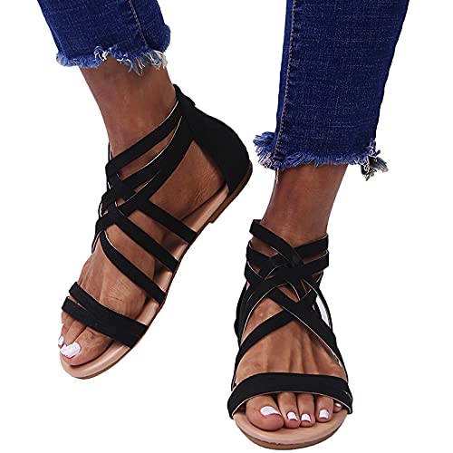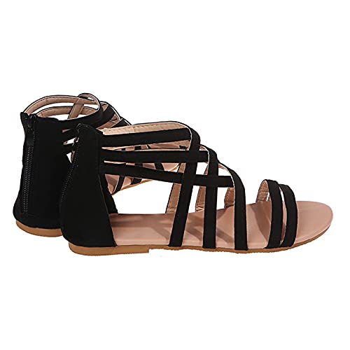 XOXSION Sandali estivi da donna, comodi sandali a forma di romana, tinta unita, con chiusura lampo, vintage, in finta pelle, con dita arrotondate, bassi, Nero (Nero ), 43 EU