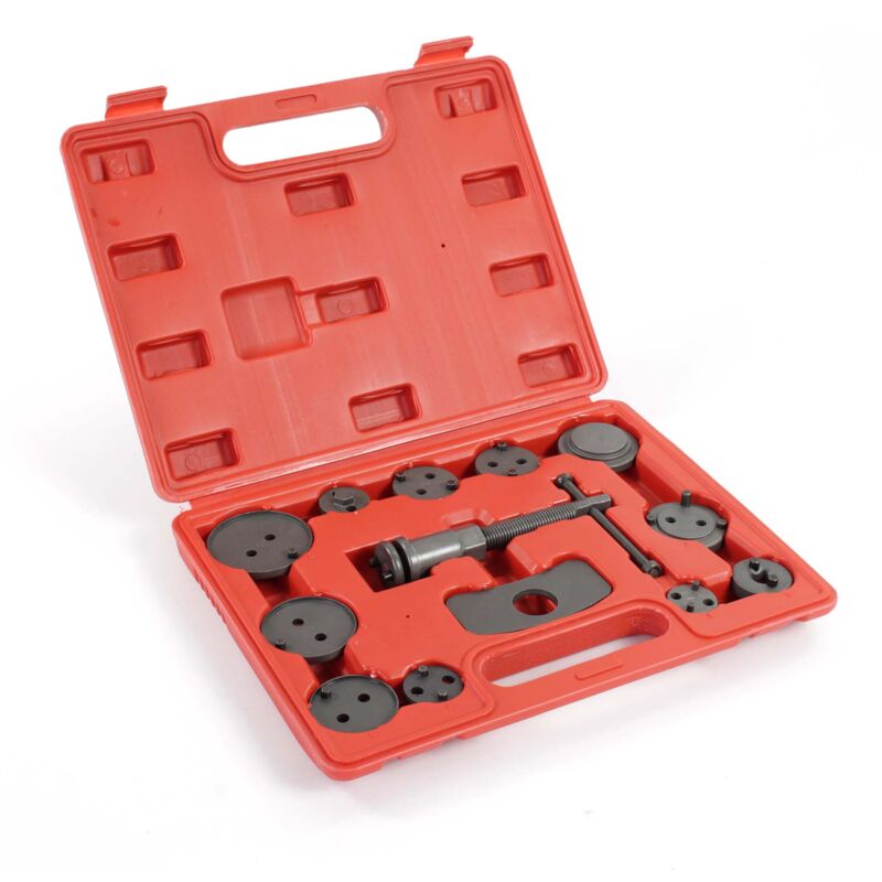 Set di 13 pezzi per arretrare i pistoncini dei freni Per una sostituzione delle pastiglie dei freni facile e senza danni Impedisce lo slittamento e l'inceppamento dei pistoni dei freni Facile da usare grazie al mandrino che ruota in senso orario In una pratica custodia per il trasporto Questo set di 13 pezzi per l'arretramento dei pistoni dei freni viene fornito in una pratica valigetta. Consente di spingere indietro e contemporaneamente di ruotare il pistone dei freni nella pinza del freno in tutta sicurezza, senza danneggiare il parapolvere. Questo è necessario soprattutto quando si sostituiscono pastiglie dei freni usurate, freni a disco con pinze flottanti o freni a mano integrati. Il set contiene un mandrino di pressione in senso orario, una piastra di controtenuta e undici adattatori per i pistoni dei freni, compatibili con molti tipi di veicoli. Tener contro del senso di rotazione inverso del pistone del freno specificato dal costruttore del veicolo. Nel nostro set è incluso un