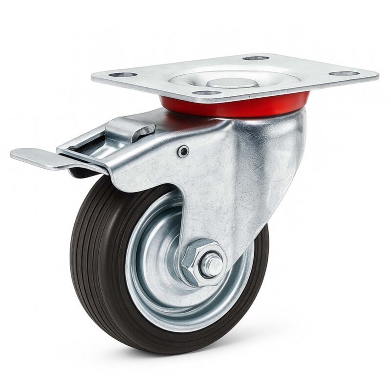 Dimensioni pratiche - - Rotella pivotante da 75 mm per manovrabilità superiore [Trasporto silenzioso] - Rivestimento in gomma piena per movimenti fluidi e silenziosi [Stabilità garantita] - Supporto girevole con freno per una sicurezza ottimale [Capacità elevata] - Sostiene carichi fino a 50 kg, ideale per utilizzi intensivi [Montaggio semplice] - Facile da installare, grazie alla piastra di montaggio Ruota in gomma piena con cerchio in metallo. Dotata di supporto girevole con freno per eseguire il montaggio sui veicoli a mano. Il trasporto a mano di carichi da un luogo all'altro richiede l'utilizzo di mezzi adatti a tale scopo. Affinché questi ultimi siano sufficientemente sicuri e stabili, devono ovviamente disporre di ruote adeguate. La nostra ruota pivotante robusta, avente un diametro di 75 mm, è ideale per rendere stabili i vostri carrelli o altri mezzi simili e trasportare carichi in totale sicurezza da un luogo all'altro. Rivestita in gomma piena, questa ruota si