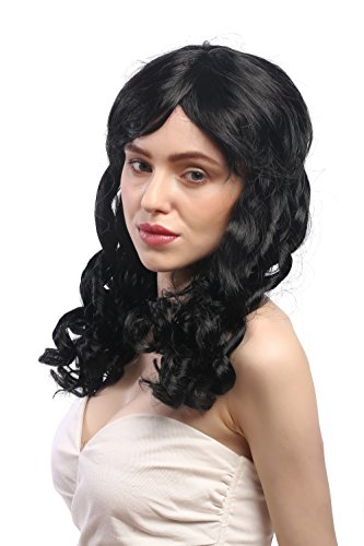 Parrucca da party lunga con frangetta impertinente, i cui capelli scendono in carini ricci a cavatappo o meglio a spirale, splendida per idee di costume fiabesche dal Barocco fino al Biedermeier, per lolita gotica così come per principessa, per feste medievali, picnic vittoriani o convention di Cosplay. Colore: nero. Codice colore: P103. Lunghezza: circa 50 cm.