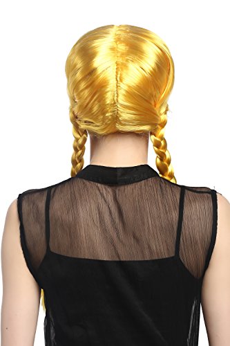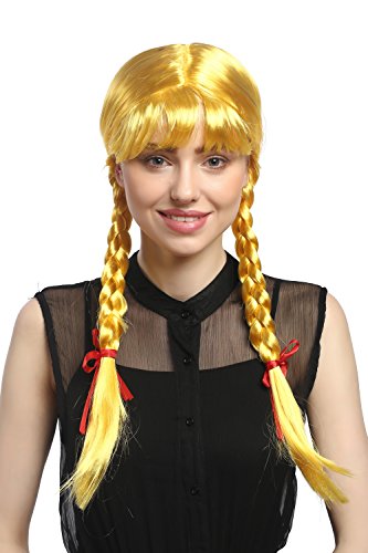 Parrucca da party con due lunghe trecce, fiocchi e frangetta impertinente- per scolarette e lolita da cosplay o per un semplice stile da ragazzetta da rendere pericolosamente dolce. Colore: giallo. Codice colore: PC2B. Lunghezza: circa 60 cm.