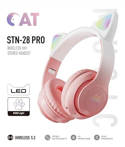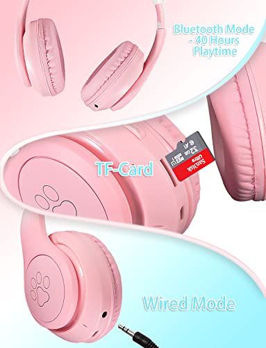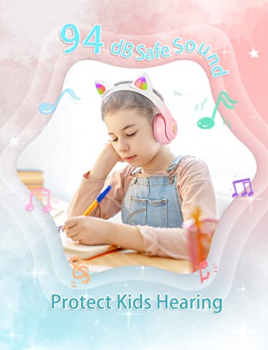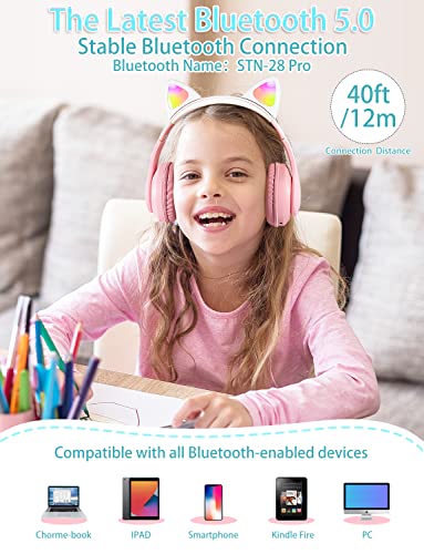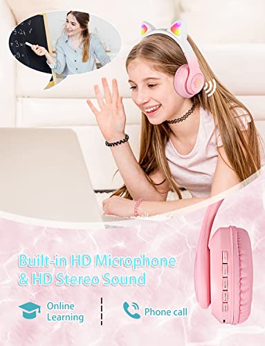 XtenKea Cuffie Bluetooth per Bambini con Orecchie da Gatto, Cuffie Wireless con microfono e illuminazione LED, Pieghevole Over-Ear Cuffie per Smartphone/scuola/scrivania/PC/Kindle (Rosa)