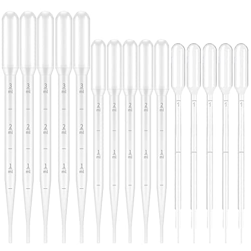 Confezione Include: 300 Pezzi Pipetta Contagocce, 1ml/2ml/3ml 100 cad, Soddisfa le tue diverse esigenze. Dimensioni (lunghezza): ca.14,2 cm/14,5 cm/15,5 cm. Pipette abbastanza trasparenti da misurare facilmente i liquidi e vedere il liquido all'interno. Pipetta plastica adatto per un uso singolo.