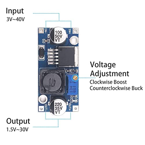 【Facilmente regolabile】: collegare l'alimentazione, monitorare la tensione con un multimetro, regolare il pulsante di rotazione sul potenziometro blu per ottenere la tensione richiesta, aumentare in senso orario e aumentare in senso antiorario. Nota: l'impostazione predefinita di fabbrica è 18V. Prima che la tensione inizi a diminuire, è necessario ruotare nella direzione inversa per circa 7-8 giri, 1 giro significa +/- 1V