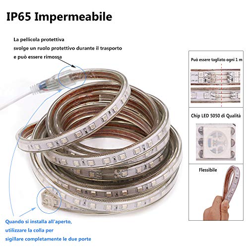 【Striscia LED IP65 impermeabile】LED SMD 5050 di qualità. Profilo più spesso con tubo in PVC trasparente per una migliore durata e impermeabilità, perfetto per applicazioni interne o esterne. Attenzione! Le 2 estremità della striscia non sono sigillate, quindi devono essere protette dall'acqua e non possono essere messe sott'acqua.
