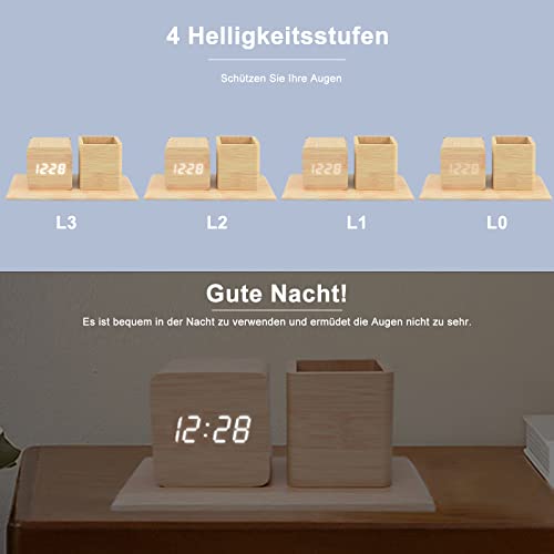 XunHe Sveglia digitale in legno con portapenne, controllo vocale, sveglia con visualizzazione data e temperatura, orologio da tavolo alimentato a batteria (legno di bambù + luce bianca)