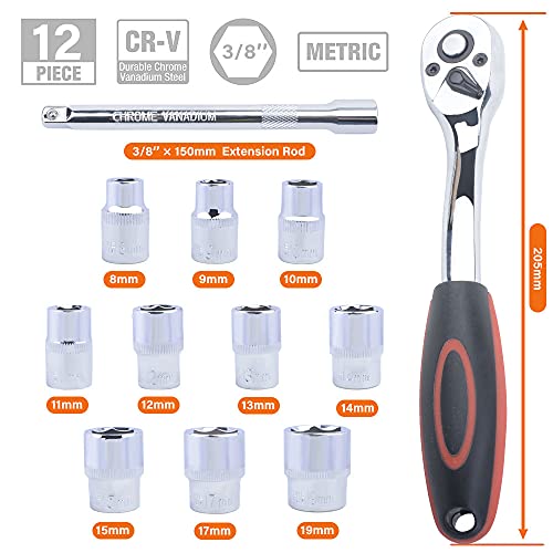 XYZDOUBLE 12 Pezzi Set di Chiavi a Bussola con Cricchetto da 3/8" 8 mm - 19mm Inserti Esagonali e Prolunga da 200mm Cricchetto Reversibile in Cr-V con Pulsante di Scatto