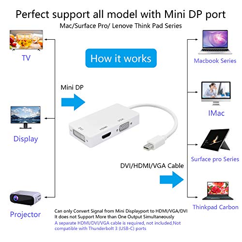 YACSEJAO 3-in-1 Mini DP a HDMI, DVI, adattatore VGA 4K Mini Displayport 1.2 Converter, Thunderbolt e Thunderbolt 2 porte compatibili per MacBook, PC, proiettore, Surface Pro
