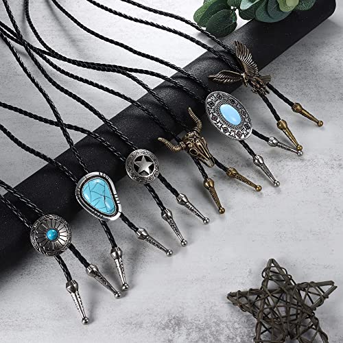 YADOCA 6 Pezzi Cravatta Bolo in Pelle Turchese Forma Rotonda Western Cowboy Cravatta Pelle Nera Naturale Accessori per Costume Halloween per Uomo Donna A