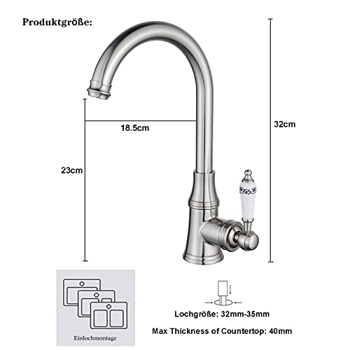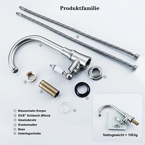✅ Facile da installare - Il miscelatore da cucina retrò con tubi dell'acqua G3/8" da 60 cm e raccordi inclusi, foro di montaggio: circa 32 - 45 mm adatto per attacco standard tedesco, semplice processo di installazione, non è necessario chiamare un idraulico, risparmiare tempo e denaro.
