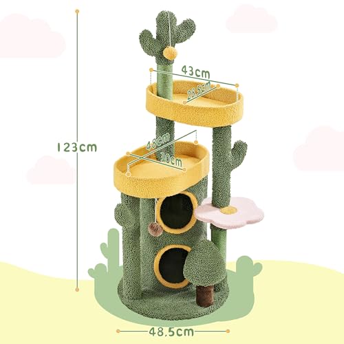 Yaheetech Albero Tiragraffi per Gatti 123 cm con Condomini Posatoi 2 Palle da Gioco a Forma di Cactus Torre da Interno Verde e Giallo