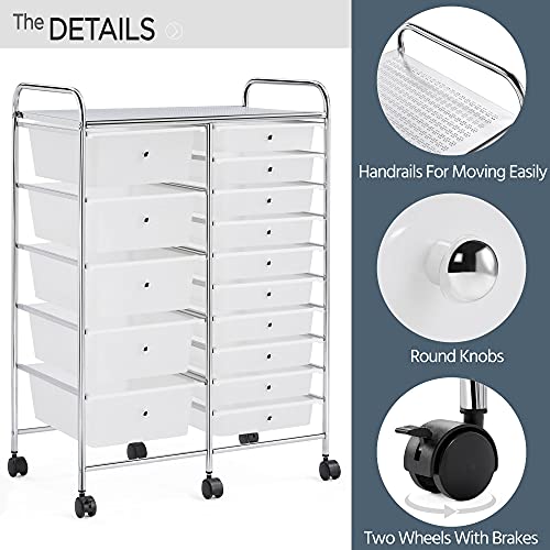 Yaheetech Cassettiera Torre di stoccaggio Carrello Portaoggetti con 15 Cassetti in PP e Ferro per Ufficio/Sala da Pranzo/Cucina/Dispensa/Soggiorno Bianco