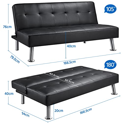 Yaheetech Divano Letto in Finta Pelle Divano Trasformabile in Letto Mobile Imbottito a 3 Posti Divanetto Reclinabile con Gambe in Metallo da Salotto Camera degli Ospiti Nero