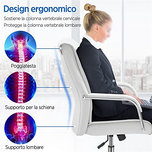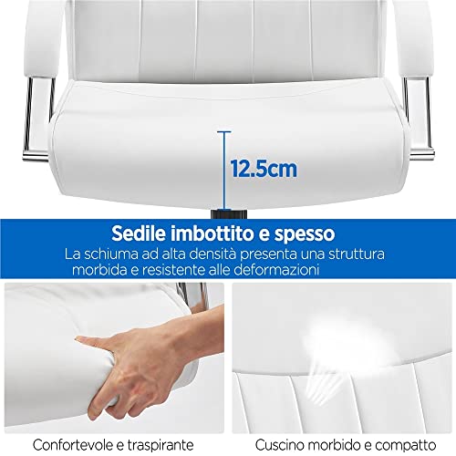 Yaheetech Sedia/Poltrona da Ufficio Scrivania Bianca in Finta Pelle Ergonomica Reclinabile a Rotelle Girevole Altezza Regolabile Portata 136 kg
