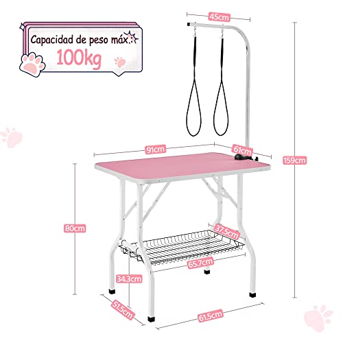 Yaheetech Tavolo da Toelettatura e Tosatura per Cani Gatti Animali Pieghevole con 2 Lacci Portata 100 kg Rosa