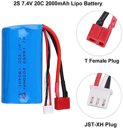 Yangers batteria ricaricabile agli ioni di litio da 2 pezzi 7.4V 2000mAh 2S 20C Connettore femmina con spina a T con caricatore USB per ponticello per camion fuoristrada per auto RC WLtoys