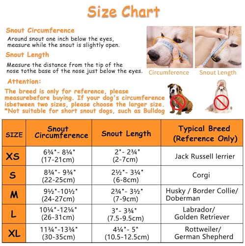 Diverse dimensioni: questa museruola per animali è disponibile in cinque misure. La museruola per cani di piccola taglia è adatta per cani di tasso, Jack Russell Terrier e così via. La museruola per cani di medie dimensioni è adatta per Border Collie, Husky e così via. La museruola grande è adatta per Labrador, Golden Retriever e pastore tedesco e così via. Ma questa museruola per cani non è adatta per cani piatti come Pit Bull e Boxer.