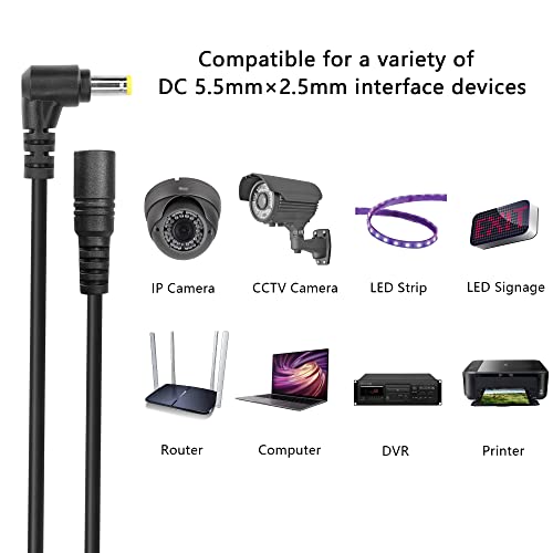 Cavo ad angolo retto DC5525: cavo di alimentazione adattatore CC da 5,5 mm x 2,5 mm maschio a femmina, dimensione della spina DC: diametro esterno 5,5 mm, diametro interno 2,5 mm. Può convertire la spina dritta a 90 gradi cavo di alimentazione a spina ad angolo retto.