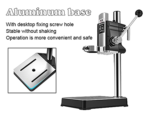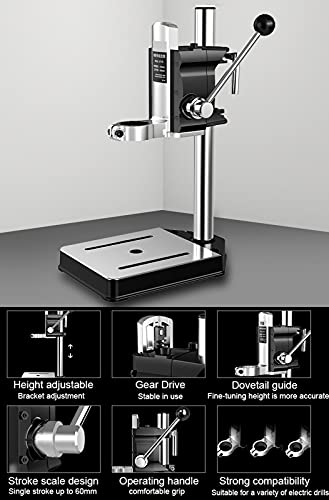 Trapano da banco universale: design con scala a 1 corsa: corsa singola fino a 60 mm, 5. asta di regolazione dell'ingegneria umana: comodo da usare, riduce l'affaticamento del lavoro, 6. forte compatibilità: trapano a colonna con 3 tipi di manicotti di plastica, adatto per una varietà di trapani elettrici.