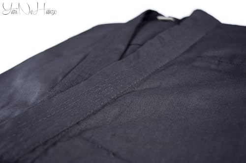 Tessuto 55% cotone / 45% poliestere 8 Oz.| Colore nero | Completo di giacca (Uwagi) e pantalone (Matashita) | 10 cuciture di rinforzo su maniche e pantaloni | Doppio tessuto di rinforzo sulle spalle | Pantaloni con chiusura tradizionale in vita | Pantaloni molto ampi per garantire la massima libertà di movimento anche indossando i Kyhan | Taglio della giacca specifico per Ninjutsu | Kanji "?" (Nin) ricamato in colore GIALLO | GIACCA CON TASCA INTERNA