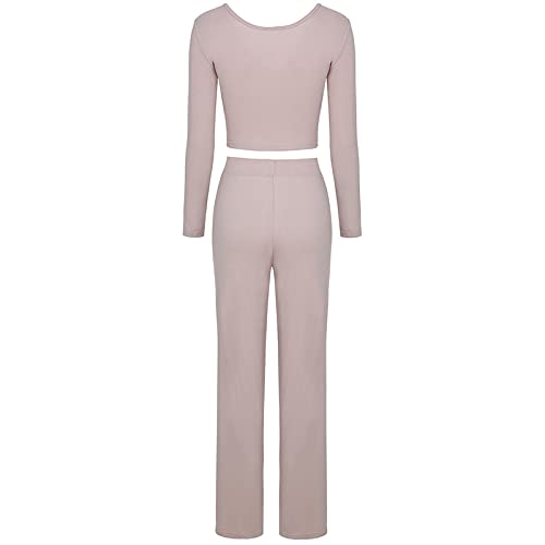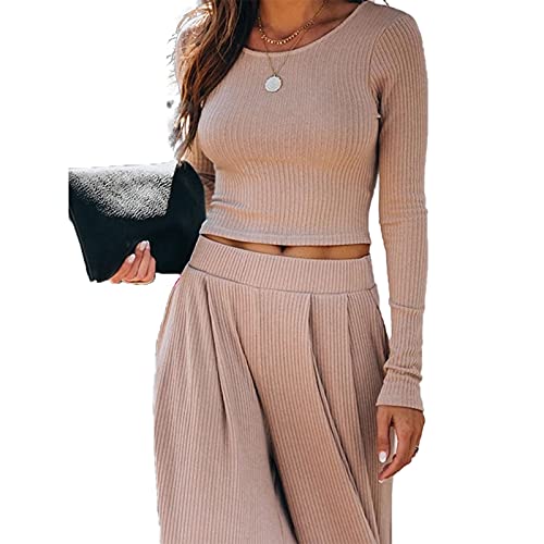 Yassiglia Tuta Donna Elegante Autunnale Completo Moda Donna Due Pezzi Completo a Manica Lunga Tinta Unita Top Corto Pantaloni Lunghi per Donna (Marrone Chiaro, XX-L)