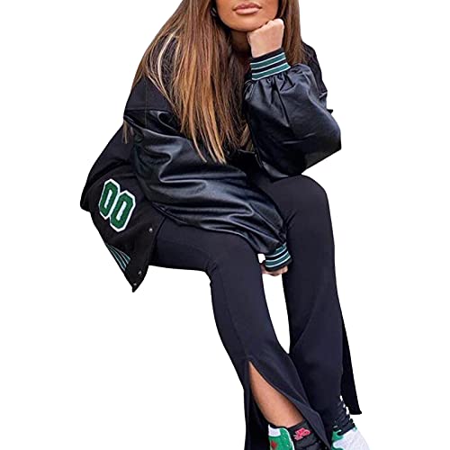Yassiglia Giacche da Baseball Oversize da Donna Giacche da Ricamo con Lettere a Maniche Lunghe in Pelle alla Moda Giacca Y2K da Donna (Nero Verde, M)