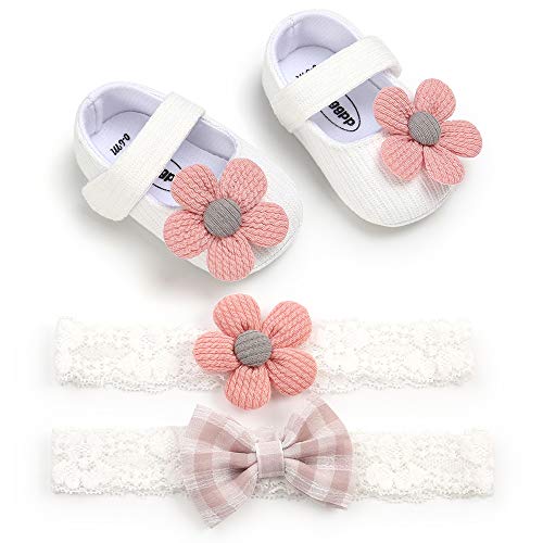 Yassiglia Set di Scarpe da Battesimo e Fascia per Capelli Suola Morbida Floreale Mary Jane Flats e Set di 3 Fasce per Capelli per Bambine (Bianco, 6-12 Months)