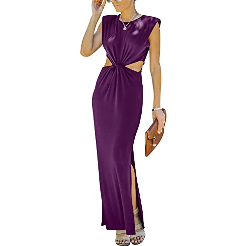 Yassiglia Vestito Donna Elegante Abito Lungo da Donna Senza Maniche Patchwork Spalla Pads Piegheggiato Cut out Vita Gonna di Un Pezzo per la Femmina (Viola, S)