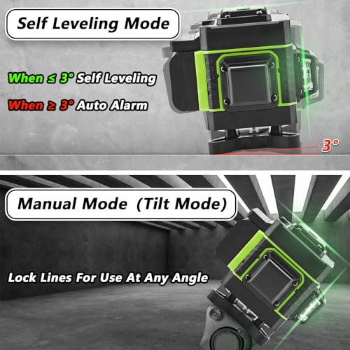 【Modalità di auto-livellamento e inclinazione intelligente】: Una volta acceso, il rilevamento automatico dell'inclinazione entra subito in funzione, con una segnalazione di lampeggio del laser quando il dispositivo supera un'inclinazione di 3 gradi. Inoltre, tenendo premuto il pulsante di accensione per 3 secondi, è possibile passare alla modalità manuale per bloccare le linee alla posizione desiderata.